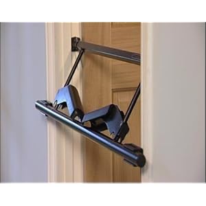 Jag kollade på såna där man sätter i dörrhål. En del är bara en stång, nån slags expandergrej. Den törs nog inte jag lita på. Det finns stadigare som liksom har ett mothåll ovanför dörren. De verkar bra, men de måste ju sitta allra högst upp. Jag har högt i tak och dörrhålen är c:a en halvmeter högre än jag når. Stången skulle alltså komma ännu högre. Det verkar ju lite läskigt då särkilt om man ska hålla på och böka med stolar och grejer.